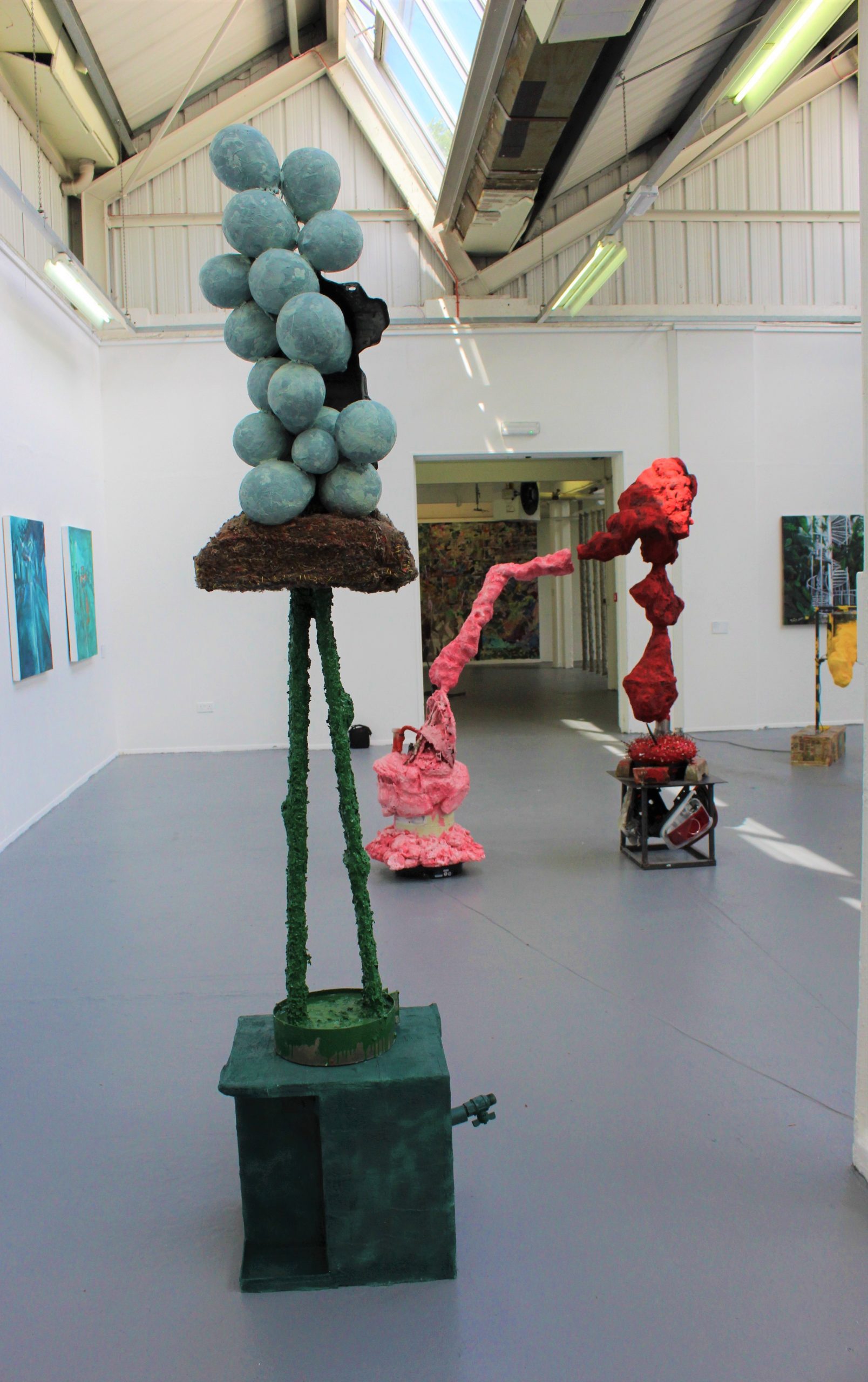 Lydia Freeman’s sculptures take the form of ambiguous, bulbous plaster shapes, balanced by and fused with metal frames and discarded objects. As they move, these non-human forms have the potential to be perceived as alive, as strange pseudo-bodies. The juxtaposition of hard and soft bodies recall childhood memories of workshops and hospitals: the metal components of cars splayed out around their empty shells; the image of green stomach bile in a flaccid, clear bag, and the delicate sag of skin pinned together with giant staples. The intention of Whambots (2022) is to stimulate an emotional or physical reaction, a tingling under the skin.
