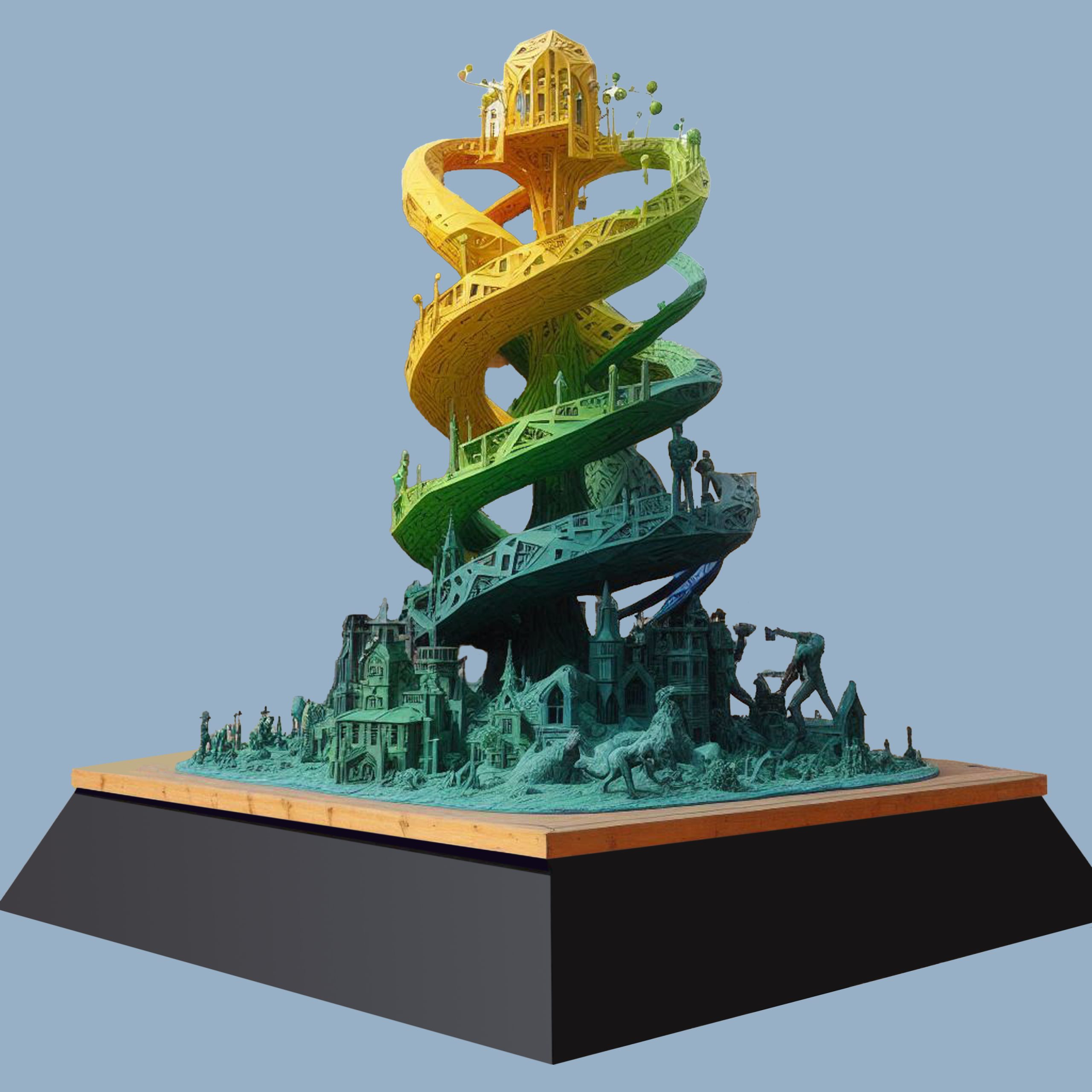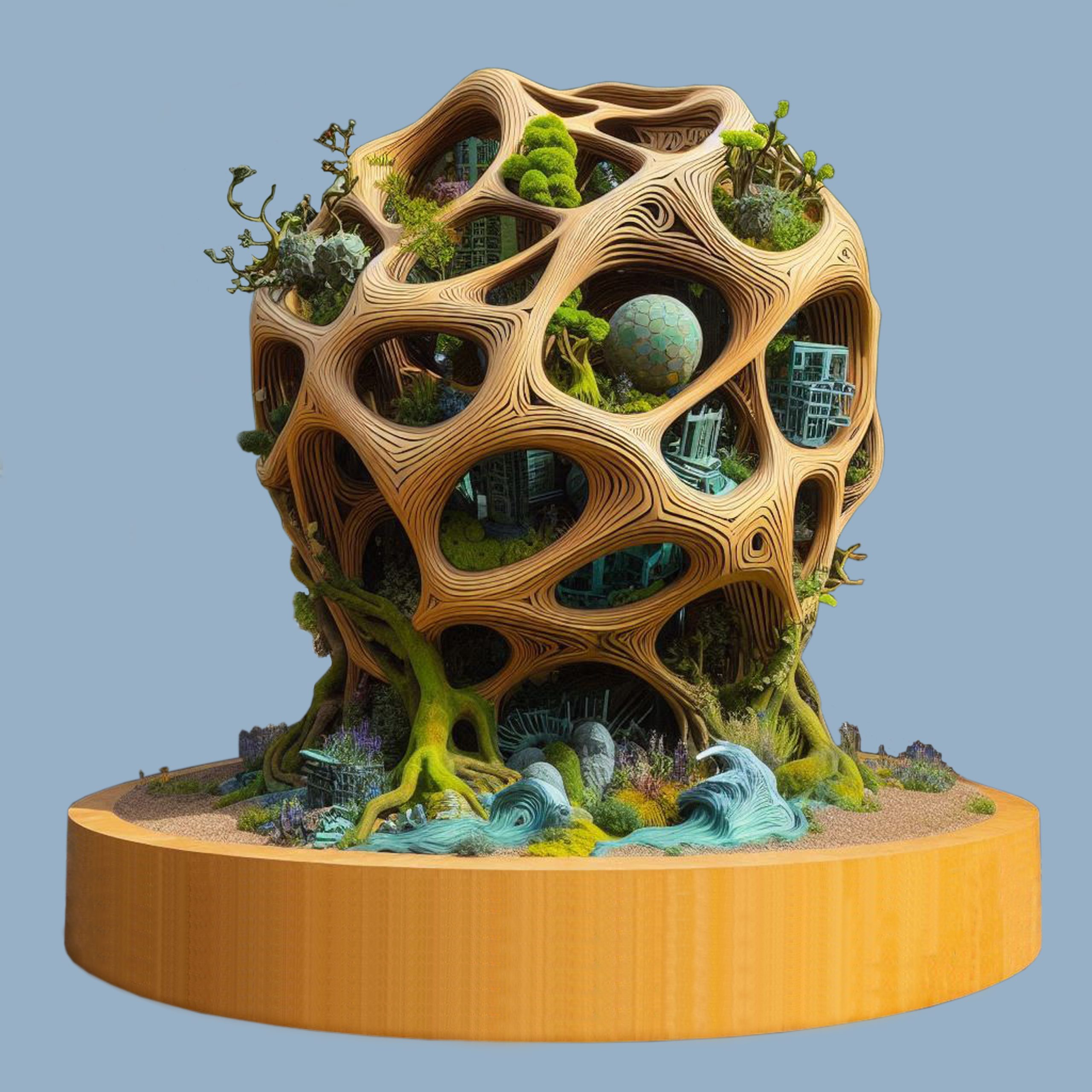 Designs for 5 entangled public sculptures situated across the city of Oxford visualised by artificial intelligence derived from the results of interviews with 5 quantum scientists from Oxford University foreseeing potential positive futures of quantum technologies, and specifying locations, colours and materials. – Suzanne Treister