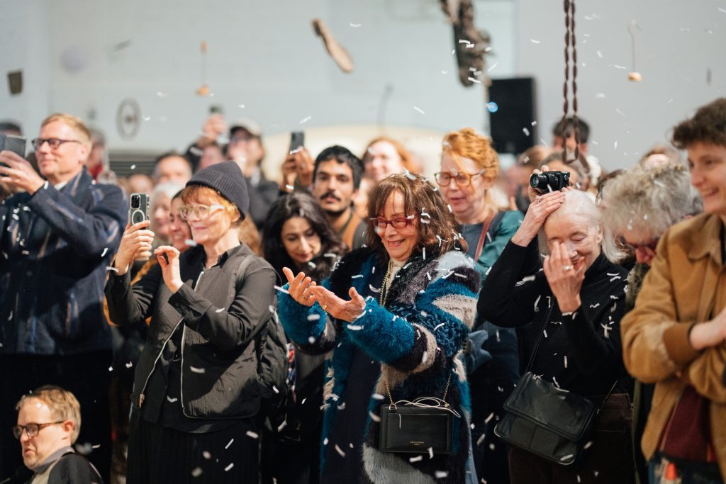 The exhibition’s Preview Party featured Anne Bean’s performance, as facsimile archival material, shredded to form confetti, was blasted from hand-powered confetti cannons across the gallery space. Visitors were showered in tiny pieces of paper, each of which was then carefully collected and displayed as part of the exhibition – stored in hessian sacks, sitting in a wheelbarrow.