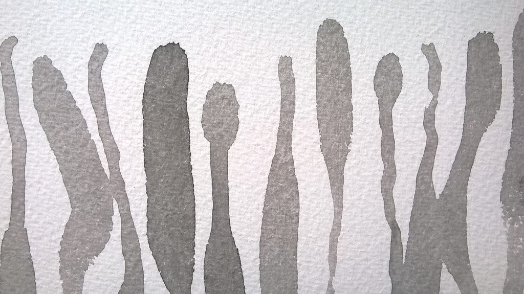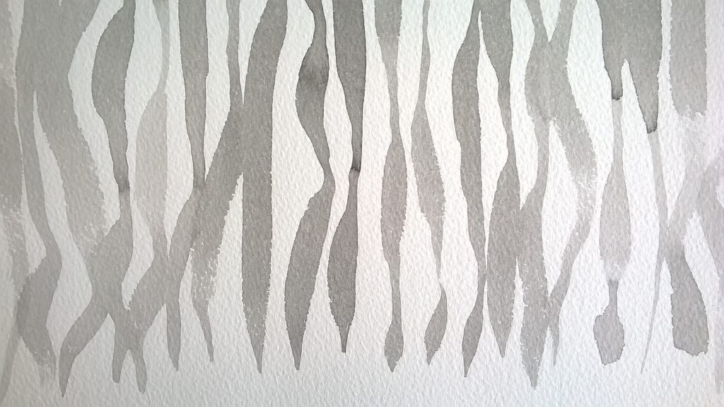 Each stroke of the painting records a single exhaled breath. The stroke began when a brush, in this case a Chinese ink brush, was dipped into a pot of thinned watercolour paint whilst drawing in a single breath. The brush was then laid at the top of the paper and the wrist drawn down the paper as the breath was exhaled.