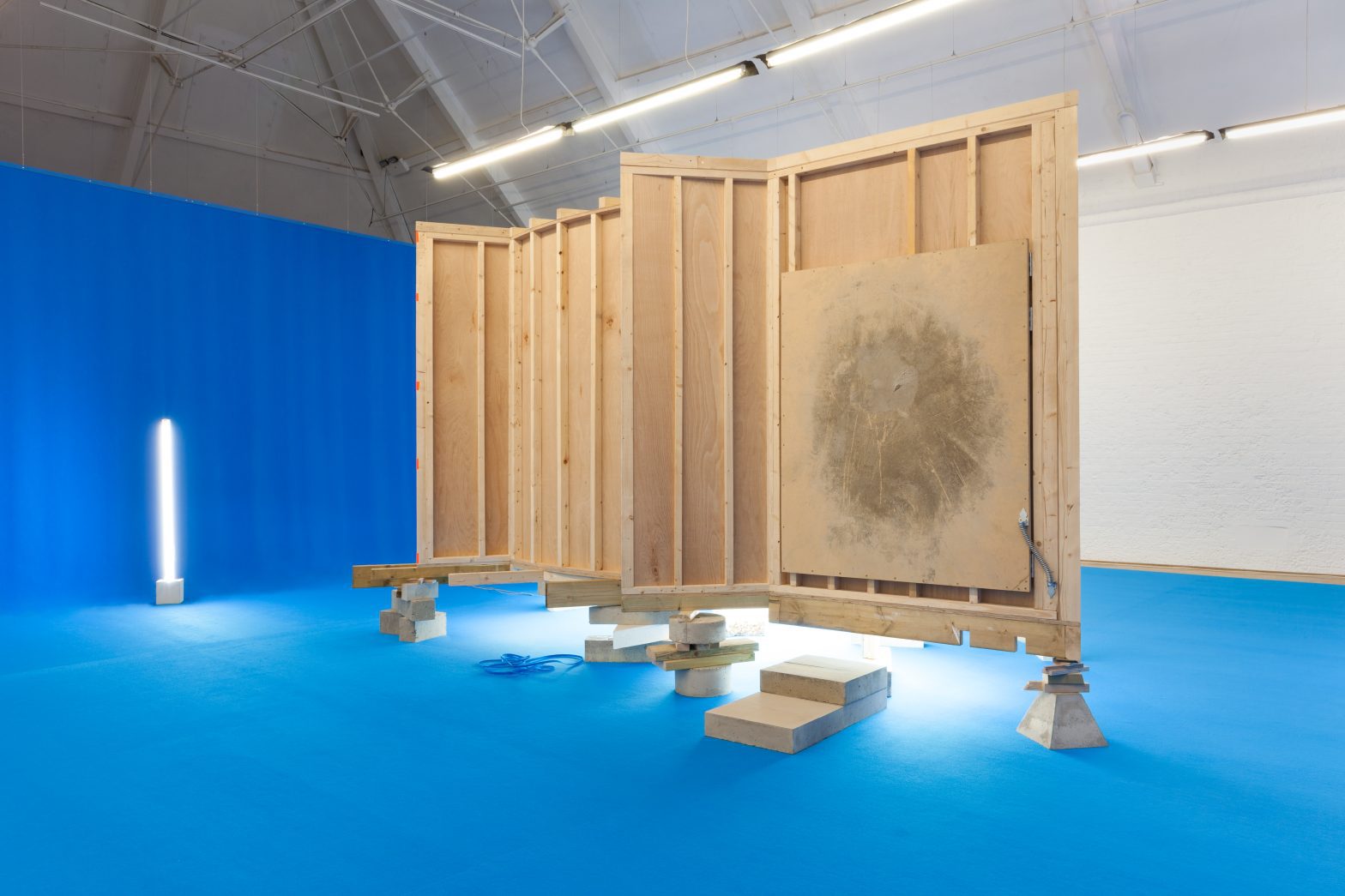 Within the spaces, we encounter built structures, objects, colour fields of carpet and audio. Her starting points for work are often found or ‘lost’ objects, for example, a breezeblock that had been adapted to be a weightlifting weight. The ‘lost’ sounds that occur in the processes of making her work are recorded, then used in audio compositions. Offcuts of hardboard from previous works are used here to define a shape for the newly built structure in the Upper Gallery.