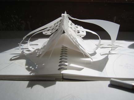 Documenting a performance with paper origami boats with candles made by Ganly in Poland in 2004, along with a selection of small sculptures and notebooks of her work.
