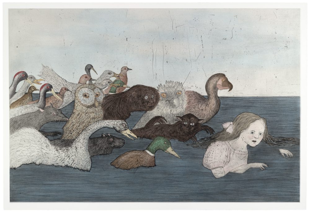 In the early 1990s Smith began depicting the natural world, starting with birds, and her art grew more mythological and folkloric. In these works, a menagerie of real and mystical creatures, delicate plants and shooting stars are presented to us in an astonishing abundance of materials. Endlessly inventive, Smith has fashioned animal assortments in bronze, shells from gold, frogs from coloured glass, birds from beads, sea creatures from ink and flowers from precious silver. Exquisitely detailed etchings and drawings can also be seen alongside large-scale tapestries depicting empowered goddesses travelling through wild forests and starlit skies.
