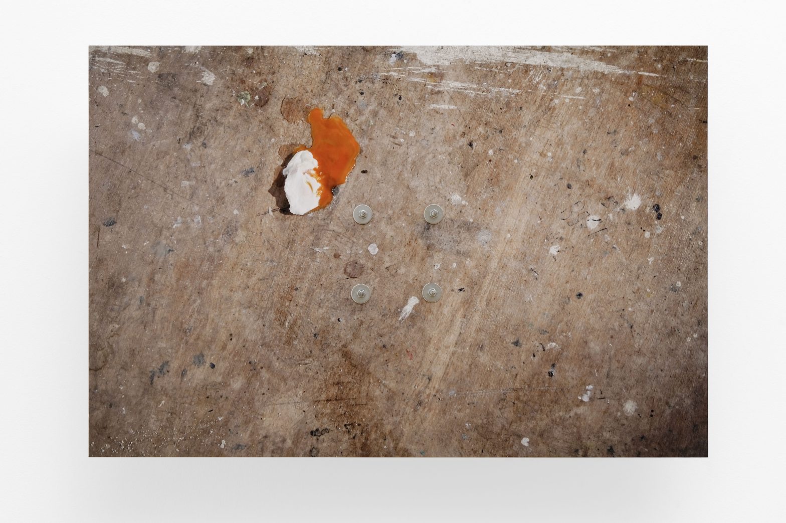 The surface of the floor is decorated with the remnants of materials used and discarded by the studio’s previous artist occupants, each of them a temporary placeholder for prime real estate in the process of redevelopment.