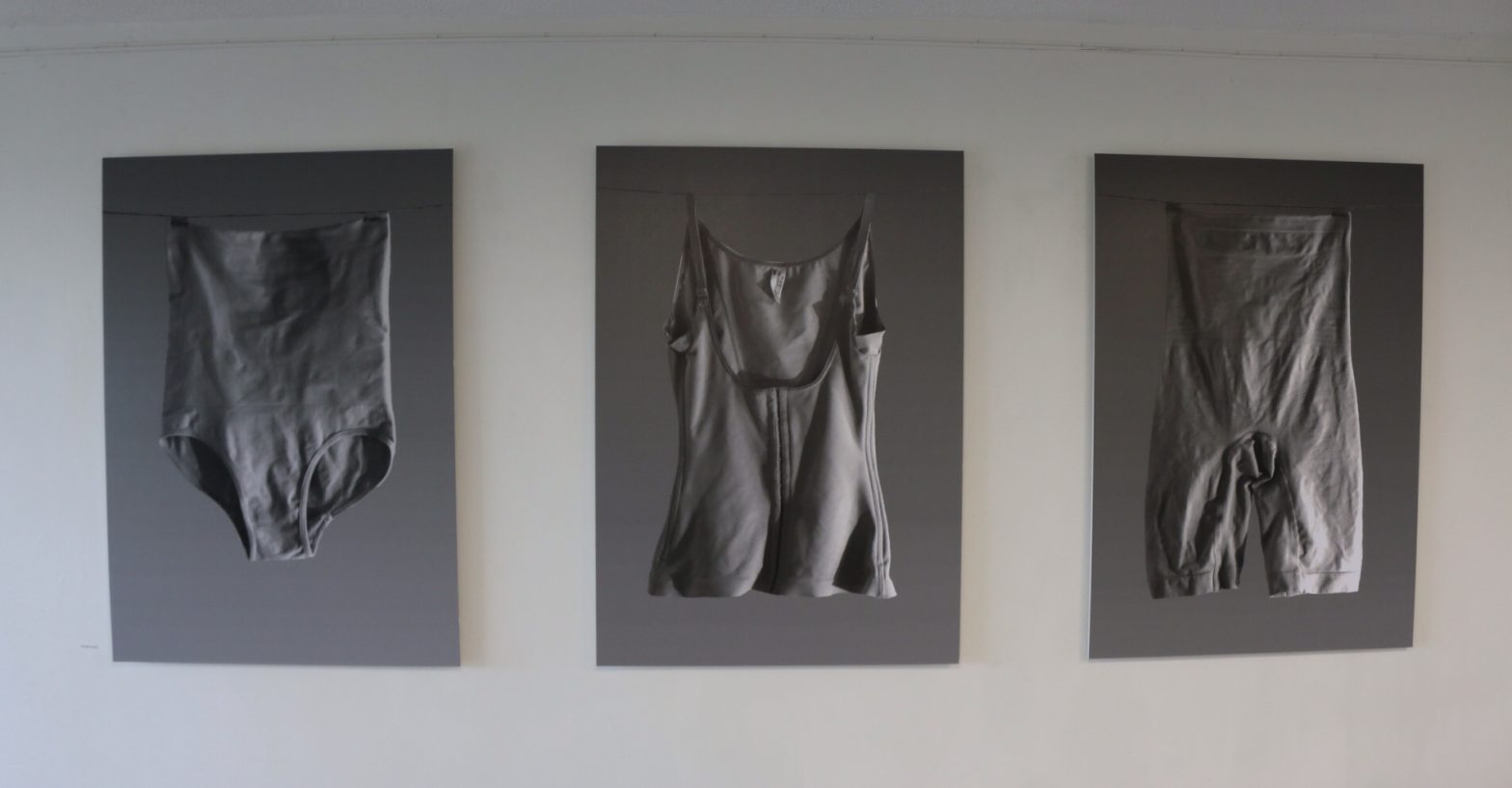 Elizabeth Holmes uses her own body to illustrate the pressure put upon all women to adhere to the modern day image of femininity. Through her photography, she models pieces of ‘clothing’ made and designed by herself, that aim to perfect the shape of the female form.
