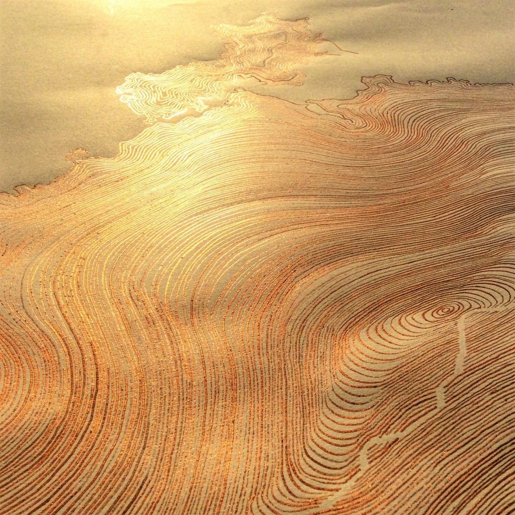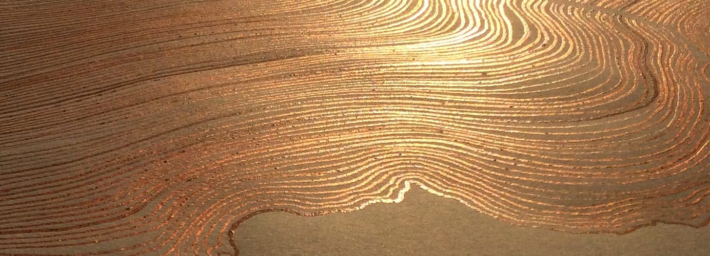 This large copper ink drawing is about movement and reflection. Stuck at home in Oxford during the lockdown, and unable to access Anglesey or the railway line, I was challenged to encounter my subject in a very different way. The drawing grew from my strong desire to return to exploring Anglesey in search of this old railway line, which can be surprisingly elusive in the landscape. I was, of course, forced to do so only in my imagination, but for an artist this just another opportunity.