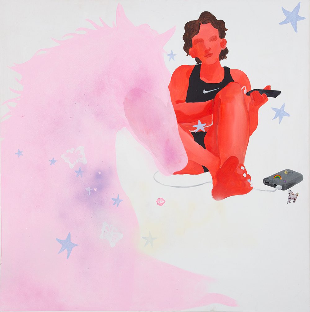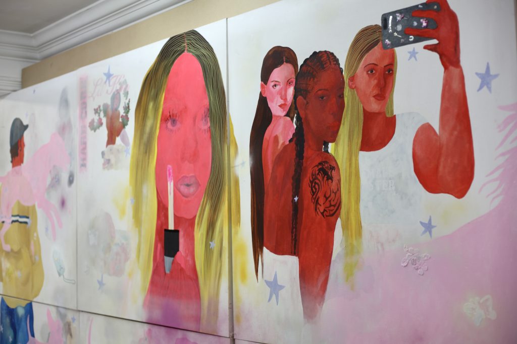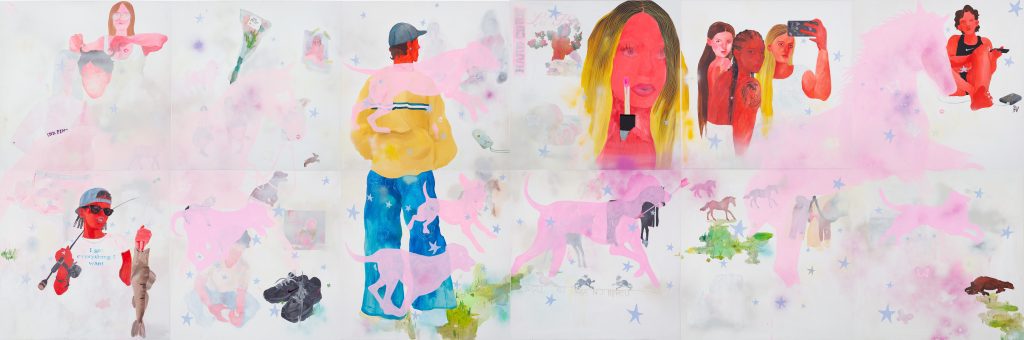Blushing girl-ish figures inhabit her landscapes-between-states. Fragments translated from ancient frescoes are painted over with beer cans and sweet wrappers, and decorated with glittery stickers to create colourful tapestries of parable and memory.